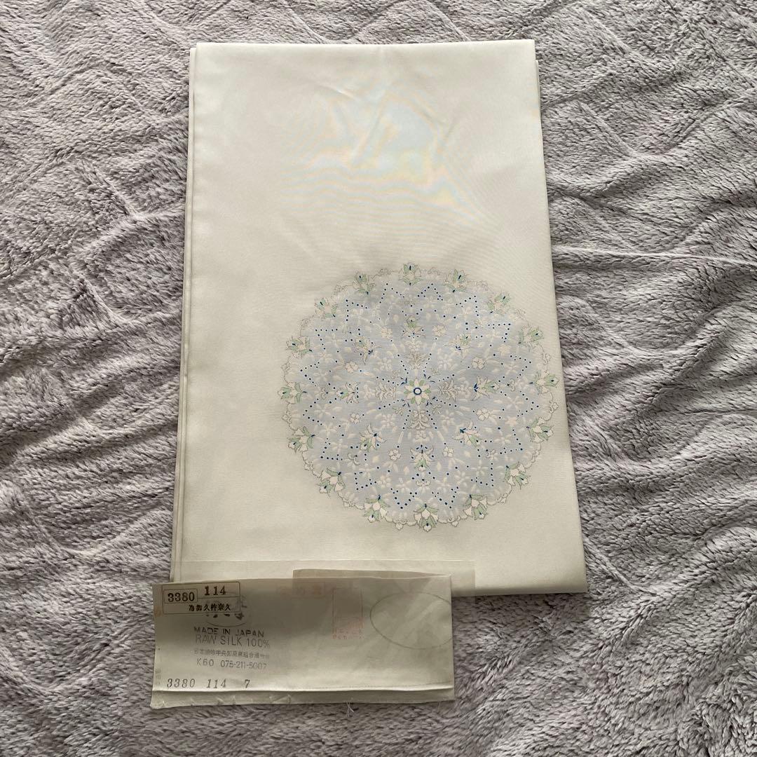 #アルスの着物と帯はこちらグレイッシュグリーンの地色に、渋いゴールドで笹蔓がおおらかに描かれた袋帯です。また、笹蔓は織りと刺繍のコンビネーションで、ふっくらと伸び伸びとした柄出し。そして、渋可愛い色合い。季節を問わない色柄で、締めるとサッと着姿が決まる帯です。洛風林や木屋太など、暖かで和やかな雰囲気の帯がお好きな方にもおすすめです。未使用美品としてリサイクルショップで購入し、私も締めていません。僅かな糸浮き・裏地の線シミ・畳みシワはありますが、特にダメージの無い美品です。◆色についてグレイッシュグリーンの地色に、渋いゴールドで笹蔓。写真で色が良く出ています。お使いの端末の設定により写真の色と実際の色が異なることがあります。ご了承の上、ご購入をお願い致します。◆ダメージについて写真11〜13のダメージはありますが、着用に差支えません。上記以外に見逃した小さな点シミ・裏シミ・帯縁ホツレがある可能性があります。また自宅長期保存品で、保存臭があります。気になる方は購入お控えください。◆サイズ cm長さ 429 幅 31素材 正絹採寸、検品ともに素人が行なっております。注意しておりますが、多少の誤差がある可能性があります。完璧をお求めのお方は購入お控えください。◆返品・キャンセルについて色合いや雰囲気が思っていたのと違う等の返品・キャンセルはお断りいたします。記載しているダメージ以外に明らかな問題があった場合↓【評価前に取引画面にてご連絡お願い致します】◆発送についてコンパクトに畳み、写真14の状態でゆうパケットポストか、ゆうパックで発送します。新たな畳みシワが出来る可能性があります。ご了承頂ける方のみ購入をお願いいたします。◆こちらは帯のみの出品です。