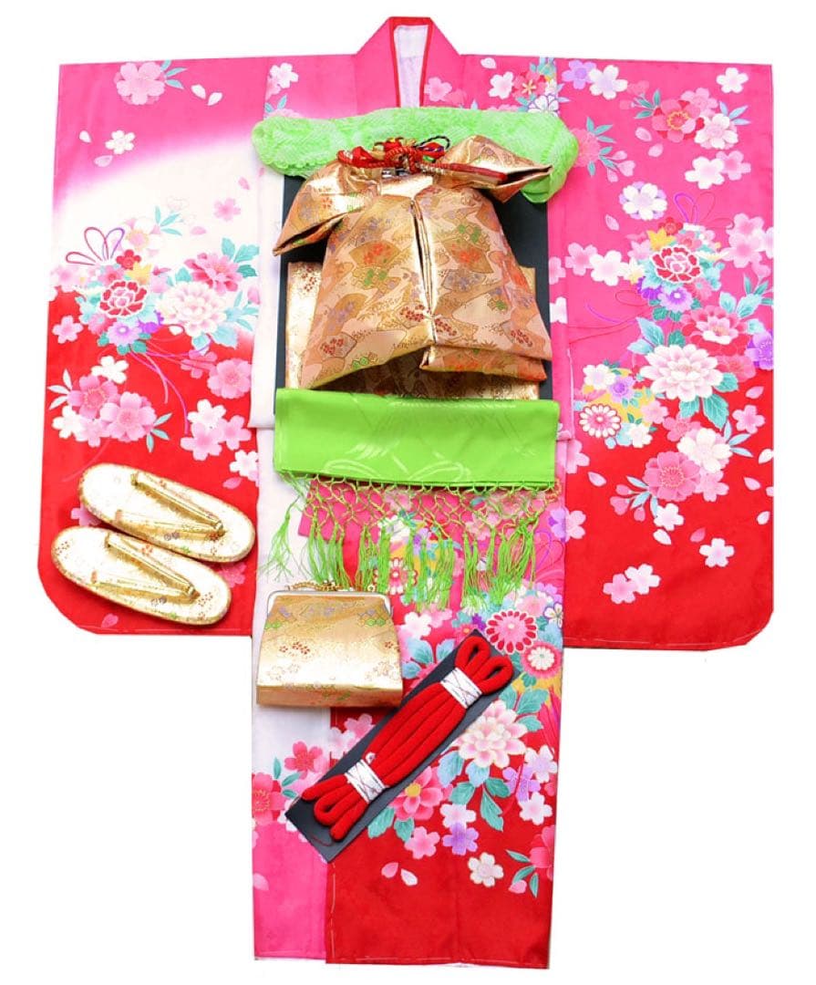 7歳のお子様向け七五三着物フルセット!!\r\rほぼすべてがそろったセットになります。\rあとはお子様の足のサイズに合った足袋と、着付けの際に使用する着付け紐をご準備いただくと着用可能です(^^)/\r\r☆セット内容\r着物 正絹\r長襦袢 刺繍入り半襟付き\r作り帯 大寸\rしごき ピンク 全長232cm\r帯揚げ ピンク 94cm×15cm\rはこせこ\r扇子\rびらかん\r丸ぐけ\r草履 21cm\rバッグ\rお守り\r髪飾り4種\r\r着物サイズ\r裄丈 56cm\r袖幅 31cm\r袖丈 75cm\r身丈 133cm\r前巾 18cm\r後ろ丈 25cm\r\r作り帯サイズ 大寸\rリボン部分 横33cm×縦32cm\r胴帯部分 全長88.5cm×縦18.5cm\r\r作り帯の胴に巻く帯に色褪せが、しごきに薄いシミが所々にあります。\r近くで見ると視認することができますが、パッと見た感じではあまり気づかない程度かなと思います。写真等で思い出を残す場合にも鮮明に映らないかと思います。\r格安出品させていただきますので上記に関してをご理解の上検討をお願いします。完品をお求めの場合はご遠慮ください。\r\r発送の際はコンパクトのたたみ発送させていただきます。また基本的に専用箱の付属はいたしません。